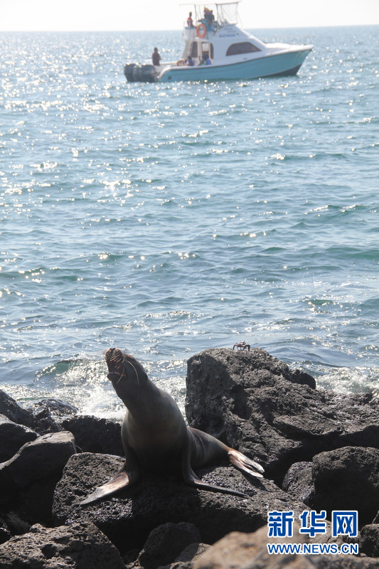 一只海獅在圣克里斯托巴(San Cristobal)島海邊的礁石上發(fā)出低叫,不遠(yuǎn)處有輪船駛過。