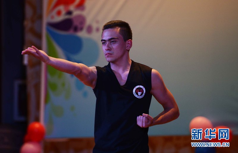 4月28日,在烏內(nèi)務(wù)部文化宮禮堂,來自烏茲別克斯坦世界語言大學(xué)的DJAVDAT(中文名:張睿)在參加比賽。新華網(wǎng)記者 沙達(dá)提攝