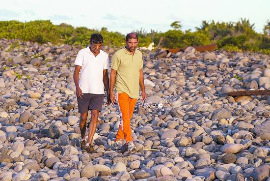 當(dāng)?shù)貢r(shí)間7月30日,約翰尼·貝格(右)和朋友一起在海灘上行走,他正是在法屬留尼旺島上發(fā)現(xiàn)疑似MH370殘骸的人。CFP供圖