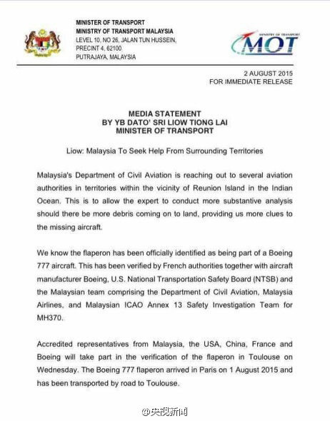 據“央視新聞”微博報道,今天(8月2日)馬來西亞交通部發(fā)表官方聲明,證實此前在法屬留尼汪島發(fā)現(xiàn)的飛機機翼殘骸屬波音777客機。馬來西亞、美國、中國、法國、波音公司組成的鑒定團隊,將于8月5日在法國圖盧茲參加鑒定工作,以確認殘骸是否屬于MH370。(央視記者朱雪松吳小望)