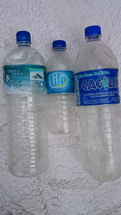 圖為當(dāng)?shù)芈蓭煱l(fā)現(xiàn)的三個(gè)礦泉水瓶,其中一個(gè)標(biāo)有中文字樣