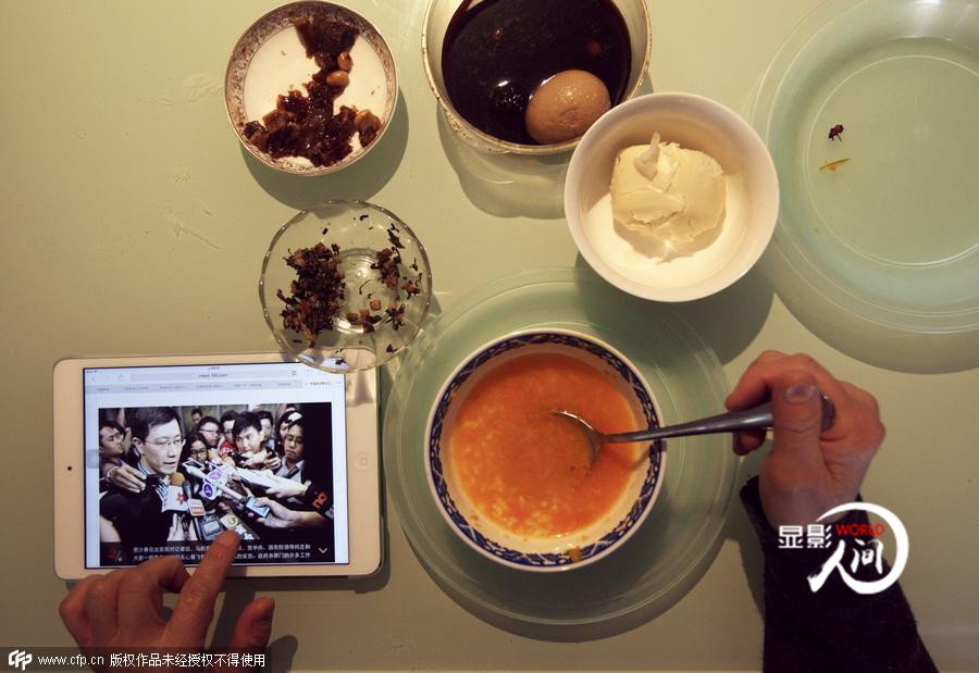 2014年3月11日,山東濟(jì)南,一名市民一邊吃著早餐,一邊翻閱IPAD,關(guān)注失聯(lián)航班MH370的最新動(dòng)態(tài)。
