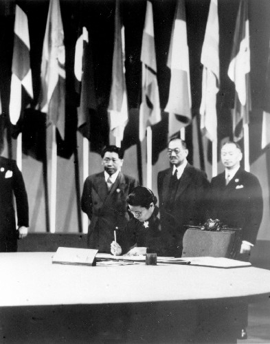 ??? 1945年10月24日,《聯(lián)合國憲章》經(jīng)安全理事會(huì)的5個(gè)常任理事國以及其他簽字國過半數(shù)批準(zhǔn),開始正式生效。聯(lián)合國作為第二次世界大戰(zhàn)之后最大的國際性組織正式成立。此后,這一天被定為聯(lián)合國日。圖為中國代表團(tuán)成員吳貽芳(前)在憲章上簽字。 新華社發(fā)