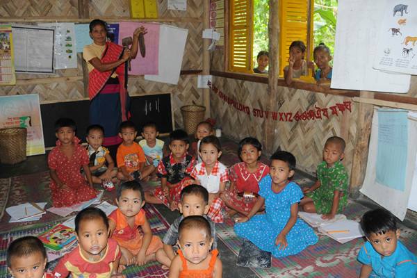 ↑2009年7月17日,孟加拉國(guó)東南部科格拉焦里縣,孩子們?cè)诼?lián)合國(guó)兒童基金會(huì)支持的社區(qū)發(fā)展計(jì)劃下接受學(xué)前教育。(新華社記者黃亞男攝)