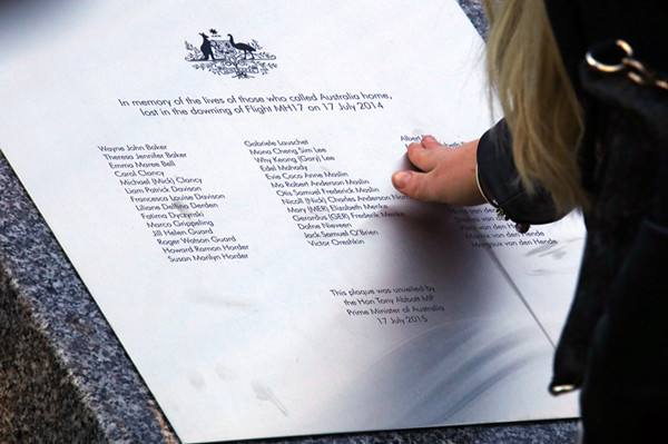 ↑2015年7月17日,在澳大利亞堪培拉議會大廈外,一名馬航MH17空難罹難者家屬撫摸紀(jì)念碑。