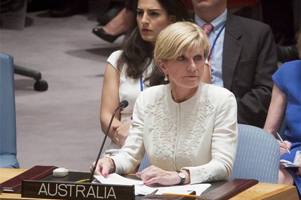 ↑2015年7月29日,在位于美國(guó)紐約的聯(lián)合國(guó)總部,澳大利亞外交部長(zhǎng)畢曉普(前)在安理會(huì)上發(fā)言。
