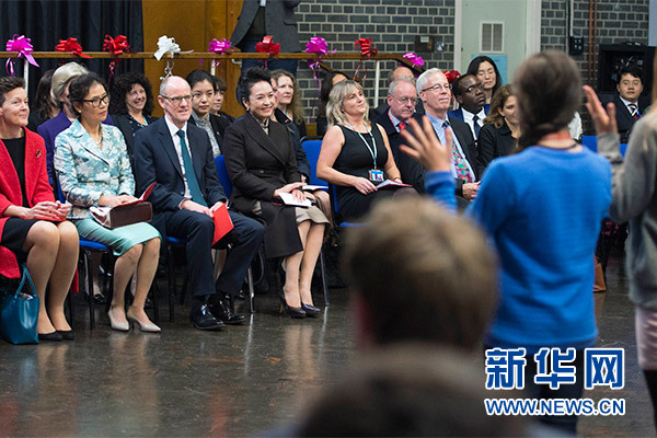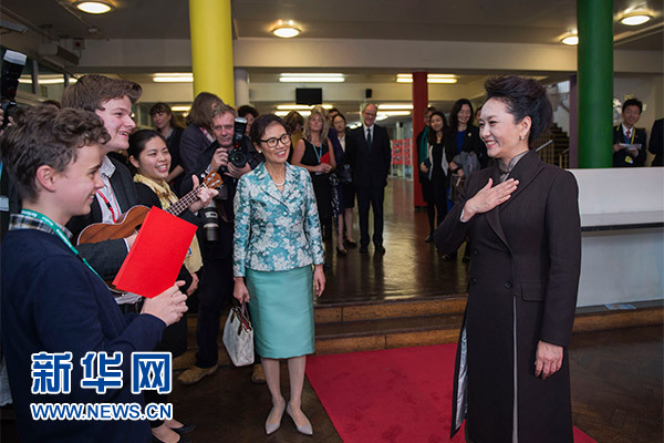 在英國教育部國務(wù)大臣吉布、學(xué)校校長等陪同下,彭麗媛觀看學(xué)生們用中文進(jìn)行的才藝表演,參觀學(xué)校成果展,觀摩中文課,與女學(xué)生們互動交流,并向?qū)W校贈送中國文化及漢語學(xué)習(xí)類圖書及音像制品。