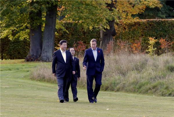 傍晚時(shí)分,習(xí)近平主席來到距倫敦市區(qū)約1小時(shí)車程的契克斯首相鄉(xiāng)間別墅,同卡梅倫一起散步,并舉行小范圍會(huì)晤。