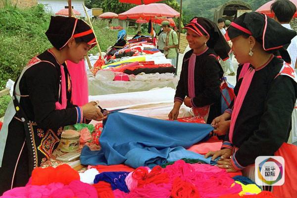 2002年2月9日,在云南省金平縣金水河鄉(xiāng),瑤族婦女李春蘭(左)在中越邊境的金水河口岸向越南少數(shù)民族婦女出售布料。