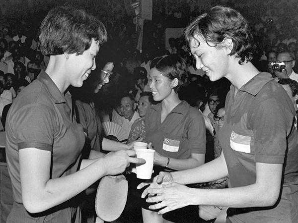 1972年7月8日至7月15日,中國乒乓球代表團應(yīng)邀對新加坡進(jìn)行友好訪問。訪問期間,中、新兩國運動員通過友好比賽,相互學(xué)習(xí),交流經(jīng)驗,增進(jìn)了友誼。圖為中、新兩國乒乓球運動員在比賽場上。