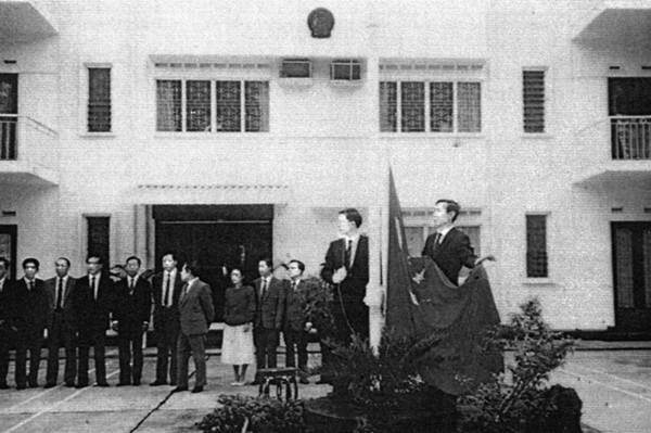 1990年10月15日,中國駐新加坡大使館舉行開館升旗儀式。新華社記者李永明攝