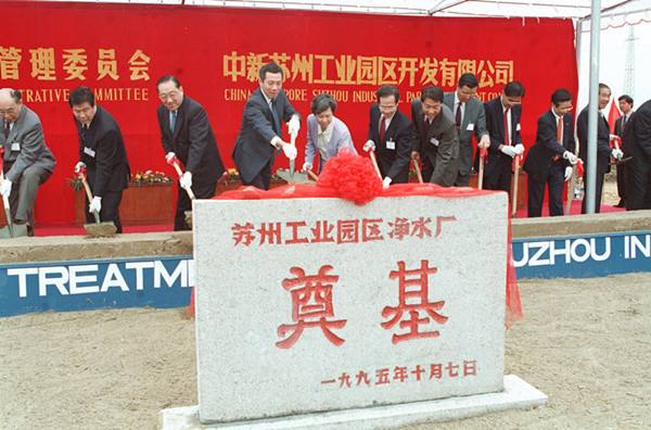 為了加快蘇州工業(yè)園區(qū)的建設(shè),中新兩國政府聯(lián)合協(xié)調(diào)理事會第二次會議1995年10月7日在江蘇蘇州舉行。新加坡副總理李顯龍、中國副總理李嵐清主持了這次會議。圖為1995年10月7日會議代表參加蘇州凈水廠的奠基儀式,左三為李嵐清,左四為李顯龍。