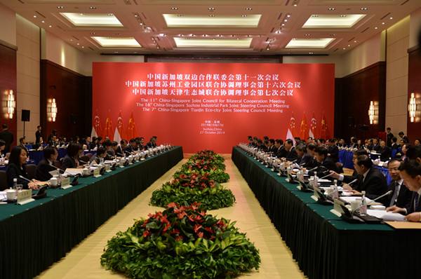 圖為10月27日拍攝的中新三個高層合作機制會議現(xiàn)場。2014年10月27日,中國新加坡雙邊合作聯(lián)委會第十一次會議、中國新加坡蘇州工業(yè)園區(qū)聯(lián)合協(xié)調(diào)理事會第十六次會議和中國新加坡天津生態(tài)城聯(lián)合協(xié)調(diào)理事會第七次會議在蘇州舉行。