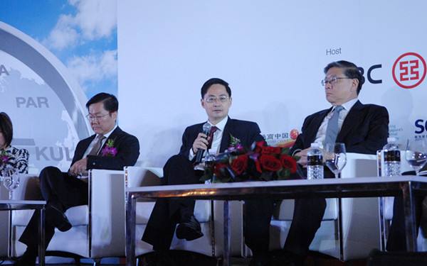 圖為2014年9月22日,中國人民銀行首席經(jīng)濟學(xué)家馬駿(中)在工行新加坡分行舉辦的人民幣國際化峰會上分享看法。當(dāng)日,中新兩國金融及其他企業(yè)界人士、政府官員等數(shù)百人參加了舉行的人民幣國際化峰會,共同討論人民幣國際化的前景和路徑。