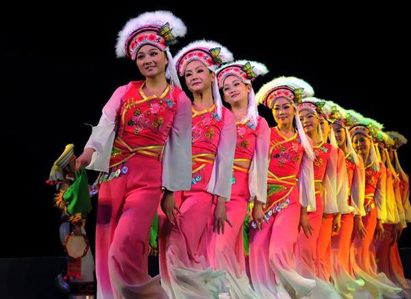 2014年1月,云南“滇韻彩云南”演出團春節(jié)赴新加坡演出。圖為演員在排演景頗族歌舞《目瑙縱歌》。