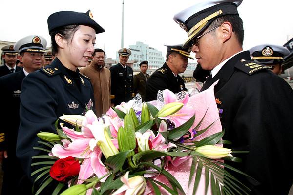 圖為中國海軍女兵向來訪的新加坡海軍軍官獻(xiàn)花。2010年3月8日,新加坡海軍登陸艦首訪上海。 當(dāng)日,新加坡海軍“堅持”號登陸艦在艦長李順達(dá)海軍中校率領(lǐng)下駛抵上海,開始對上海進(jìn)行為期5天的友好訪問。這是“堅持”號第一次訪問上海。