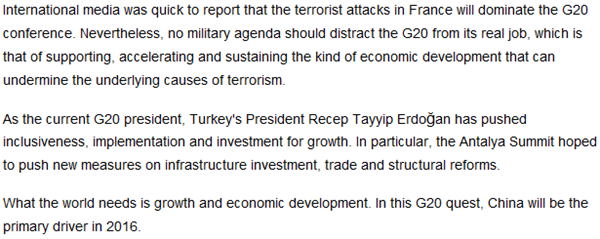 二十國(guó)集團(tuán)領(lǐng)導(dǎo)人第十次峰會(huì)于15日下午在土耳其安塔利亞舉行第一階段會(huì)議。在二十國(guó)集團(tuán)的不斷探索與實(shí)踐中,中國(guó)無(wú)疑將成為2016年世界經(jīng)濟(jì)的主要驅(qū)動(dòng)力。