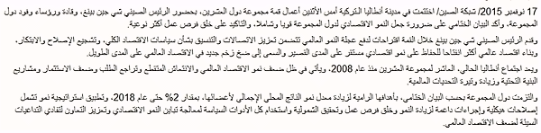昨日,二十國(guó)集團(tuán)領(lǐng)導(dǎo)人第十次峰會(huì)在土耳其安塔利亞閉幕。中國(guó)領(lǐng)導(dǎo)人習(xí)近平期間出席了峰會(huì),并發(fā)表題為《創(chuàng)新增長(zhǎng)路徑 共享發(fā)展成果》的重要講話,其中強(qiáng)調(diào)二十國(guó)集團(tuán)要加強(qiáng)宏觀經(jīng)濟(jì)政策溝通和協(xié)調(diào),推動(dòng)改革創(chuàng)新,構(gòu)建開放型世界經(jīng)濟(jì)。