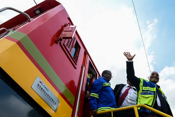 2015年3月19日,南非總統(tǒng)祖馬(右)從“曼德拉一型” 第95臺電力機(jī)車上走下來時(shí)向大家揮手致意。(新華社記者翟健嵐攝)