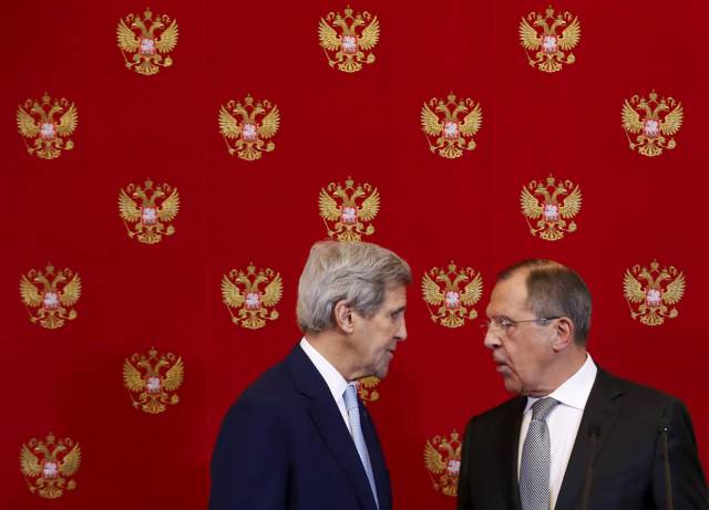 2015年12月15日,俄羅斯外長(zhǎng)拉夫羅夫(右)同美國(guó)國(guó)務(wù)卿克里在莫斯科克里姆林宮出席記者會(huì)。 新華社/路透
