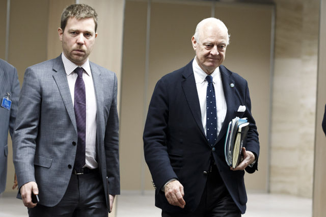 3月18日,在瑞士日內(nèi)瓦聯(lián)合國歐洲總部,聯(lián)合國敘利亞問題特使德米斯圖拉(右)準備參加敘利亞問題新一輪和談。 新華社/美聯(lián)