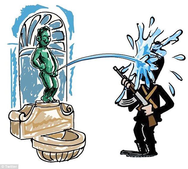 漫畫中,可愛的“撒尿小童”向代表恐怖主義的槍械和持槍者暢快地撒尿。也有網(wǎng)友將法國(guó)和比利時(shí)的國(guó)旗拼湊在一起,表達(dá)了同為恐襲受害國(guó)的法國(guó)與比利時(shí)站在一起,共同面對(duì)恐怖組織。