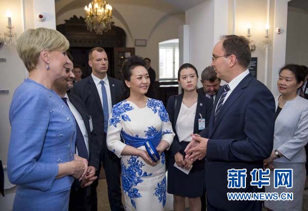 當?shù)貢r間6月20日上午,國家主席習近平夫人彭麗媛同波蘭總統(tǒng)杜達夫人阿加塔在華沙共同參觀肖邦博物館。這是彭麗媛與阿加塔聽取肖邦研究院院長什克萊納的介紹。新華社記者謝環(huán)馳攝