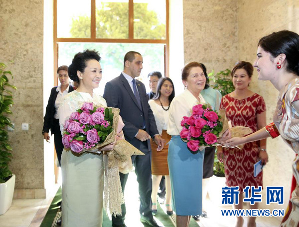當(dāng)?shù)貢r(shí)間6月22日下午,國(guó)家主席習(xí)近平夫人彭麗媛同烏茲別克斯坦總統(tǒng)卡里莫夫夫人卡里莫娃共同參觀塔什干孔子學(xué)院。這是孔子學(xué)院學(xué)生向彭麗媛和卡里莫娃獻(xiàn)花。新華社記者丁林?jǐn)z