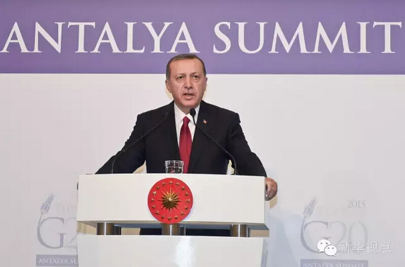 ??? 2015年11月,G20峰會(huì)在土耳其安塔利亞舉行,從安塔利亞到杭州,從地中海岸到錢塘江畔,與東道主接力棒一樣順利傳遞的,是對(duì)推動(dòng)全球經(jīng)濟(jì)穩(wěn)步復(fù)蘇、實(shí)現(xiàn)可持續(xù)增長的決心?!敖影簟焙蟮闹袊?,在議題設(shè)置上既汲取了安塔利亞峰會(huì)的智慧成果,又著眼當(dāng)前、旨在長遠(yuǎn)、彰顯新意。 2015年G20安塔利亞峰會(huì)上的埃爾多安總統(tǒng)↓