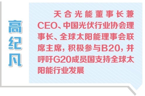 出席B20的全球太陽(yáng)能理事會(huì)聯(lián)席主席、天合光能董事長(zhǎng)兼CEO高紀(jì)凡在接受《經(jīng)濟(jì)日?qǐng)?bào)》記者采訪時(shí)表示,太陽(yáng)能發(fā)電已成為全球最便宜的電力資源之一,建議二十國(guó)集團(tuán)(G20)支持全球太陽(yáng)能理事會(huì)“至2030年在太陽(yáng)能行業(yè)創(chuàng)造1000萬(wàn)個(gè)就業(yè)機(jī)會(huì)”的目標(biāo),建立太陽(yáng)能領(lǐng)域的國(guó)家級(jí)、公私合作的數(shù)據(jù)收集和傳播網(wǎng)絡(luò)。