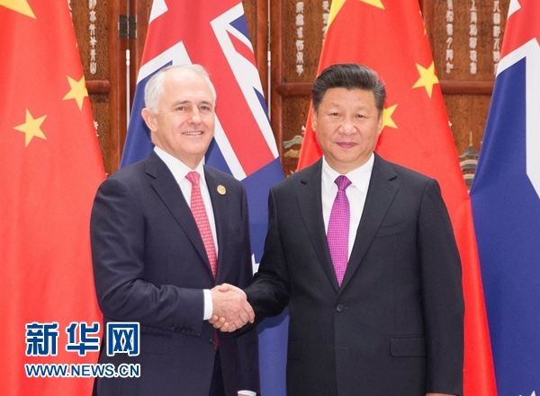 習近平指出,中方高度重視發(fā)展中澳關系。希望雙方相向而行,堅持互信互利原則,拓展務實合作,擴大人文交流,推動中澳全面戰(zhàn)略伙伴關系健康穩(wěn)定向前發(fā)展。互信是保證中澳關系順利發(fā)展的前提。中澳要尊重彼此對發(fā)展道路的選擇,尊重彼此核心利益和重大關切。我們要加強優(yōu)勢互補,繼續(xù)實施好中澳自由貿(mào)易協(xié)定,加快推進中方“一帶一路”倡議同澳方“北部大開發(fā)”計劃對接,積極拓展能源資源、農(nóng)牧業(yè)、食品加工、基礎設施建設等領域合作,更好實現(xiàn)互利雙贏。希望澳方繼續(xù)致力于為外資提供公平、透明、可預期的政策環(huán)境,這也符合澳方自身利益。要深入推進創(chuàng)新發(fā)展戰(zhàn)略對接,擴大食品、農(nóng)業(yè)、礦業(yè)、海洋科學等領域聯(lián)合研發(fā)。要深化教育、文化、旅游等領域交流,增進兩國人民相互了解和友誼。要加強反腐敗追逃追贓和反恐合作。中方愿同澳方加強在聯(lián)合國、二十國集團、亞太經(jīng)合組織、東亞峰會等機制中的協(xié)調(diào)和合作。