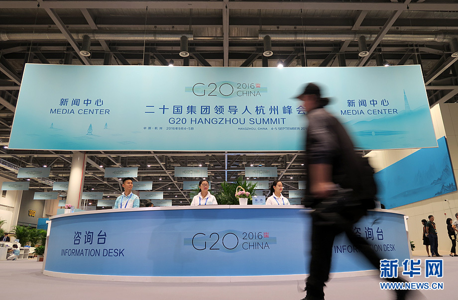 9月4日上午,金磚國家領導人非正式會晤在浙江杭州舉行。當日,G20峰會新聞中心一派繁忙景象。新華網(wǎng)記者 陳競超 攝
