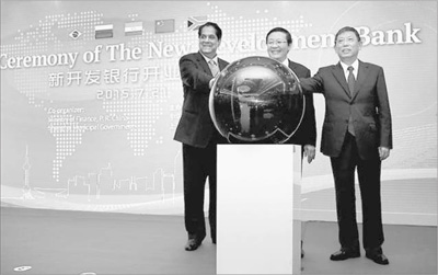 2015年7月21日,新開(kāi)發(fā)銀行開(kāi)業(yè)儀式在上海舉行。財(cái)政部部長(zhǎng)樓繼偉(中)與上海市市長(zhǎng)楊雄(右)、金磚國(guó)家新開(kāi)發(fā)銀行行長(zhǎng)卡馬特共同啟動(dòng)新開(kāi)發(fā)銀行。 資料圖片