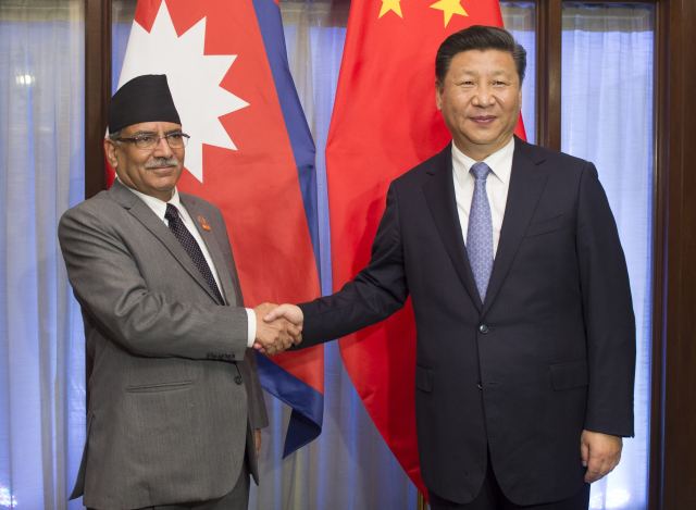 圖為10月15日,國(guó)家主席習(xí)近平在印度果阿會(huì)見(jiàn)尼泊爾總理普拉昌達(dá)。(新華社記者謝環(huán)馳攝)