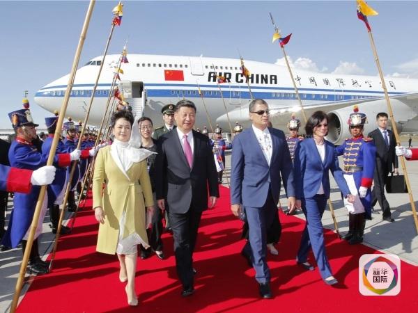 為了迎接習(xí)主席夫婦,科雷亞總統(tǒng)打破厄國內(nèi)《公共典禮條例》和總統(tǒng)不赴機場迎送外國元首的慣例,親赴機場主持隆重的歡迎儀式;兩名身著民族服裝的當(dāng)?shù)貎和蛄?xí)主席夫婦獻上鮮花;兩國元首登上檢閱臺,軍樂隊奏響中厄兩國國歌。習(xí)主席和科雷亞總統(tǒng)分別發(fā)表了熱情洋溢的致辭。