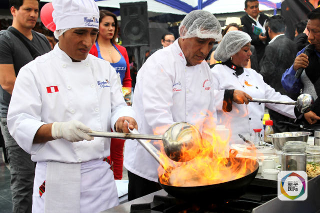 2015年9月17日,兩名廚師在秘魯美食創(chuàng)新大賽上進行炒飯技能比拼。(新華社發(fā) 路易斯·卡馬喬攝)