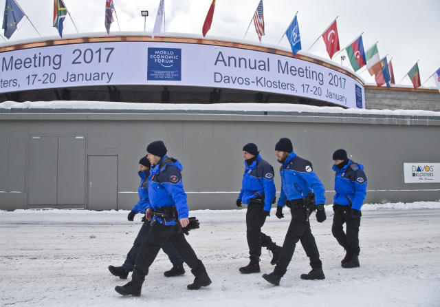 1月15日,在瑞士達(dá)沃斯,警察走過(guò)即將舉辦世界經(jīng)濟(jì)論壇年會(huì)的會(huì)議中心。(新華/美聯(lián))