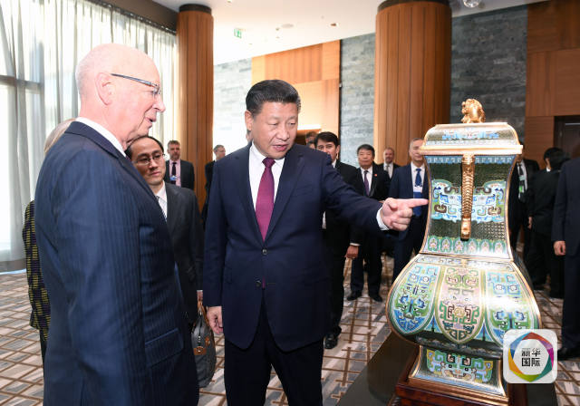 1月17日,國家主席習近平在瑞士達沃斯會見世界經濟論壇主席施瓦布。這是習近平向施瓦布介紹中華人民共和國贈送給世界經濟論壇的四面方尊。(新華社記者 饒愛民 攝)