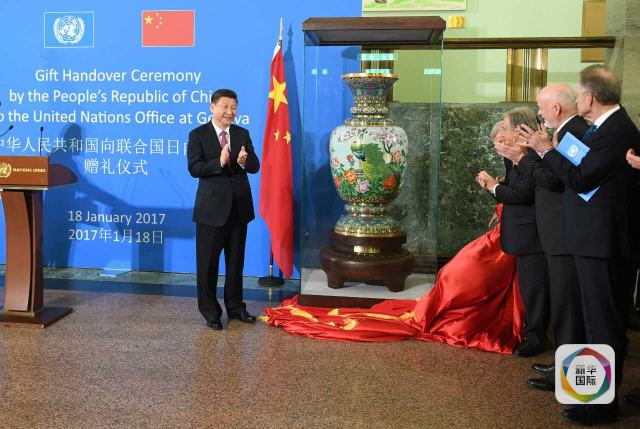 ——向萬國宮贈送景泰藍瓶。萬國宮一層大廳內,習主席和古特雷斯共同為名為“盛世歡歌”的景泰藍瓶揭幕。