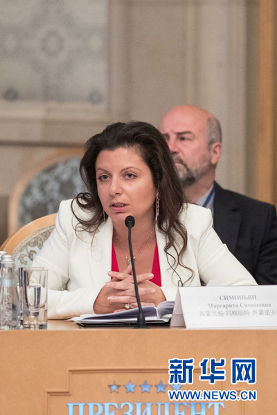 7月4日,“今日俄羅斯”電視臺總編輯西蒙尼揚在第三屆中俄媒體論壇上發(fā)言。新華社記者 吳壯 攝