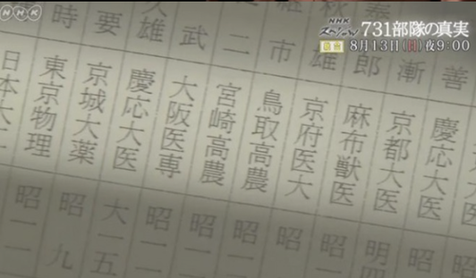 參加731部隊的機(jī)構(gòu)及人員名單(圖片來源:NHK視頻截圖)