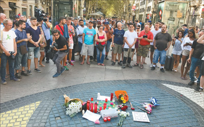 西班牙巴塞羅那恐襲事件后,受害者家屬紛紛在蘭布拉斯大街舉行悼念活動(dòng),街上行人自發(fā)停下腳步表示哀悼和慰問(wèn)。記者 王 迪攝