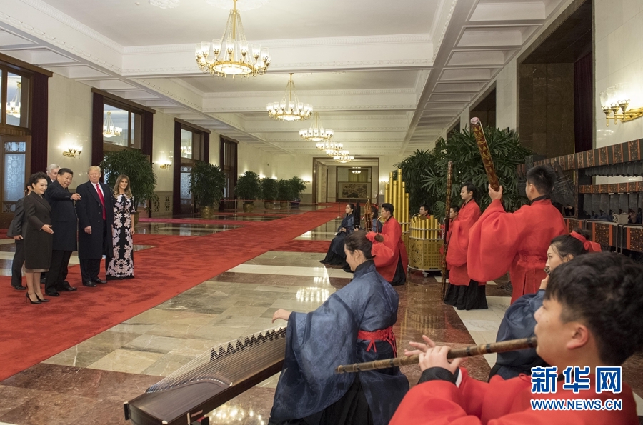 11月9日,國(guó)家主席習(xí)近平在北京人民大會(huì)堂東門外廣場(chǎng)舉行歡迎儀式,歡迎美利堅(jiān)合眾國(guó)總統(tǒng)唐納德·特朗普對(duì)中國(guó)進(jìn)行國(guó)事訪問。這是習(xí)近平和夫人彭麗媛同特朗普夫婦在人民大會(huì)堂欣賞文藝表演。新華社記者 李學(xué)仁 攝