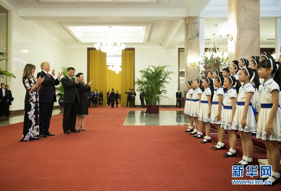 11月9日,國(guó)家主席習(xí)近平在北京人民大會(huì)堂東門外廣場(chǎng)舉行歡迎儀式,歡迎美利堅(jiān)合眾國(guó)總統(tǒng)唐納德·特朗普對(duì)中國(guó)進(jìn)行國(guó)事訪問。這是習(xí)近平和夫人彭麗媛同特朗普夫婦在人民大會(huì)堂欣賞文藝表演。新華社記者 李學(xué)仁 攝