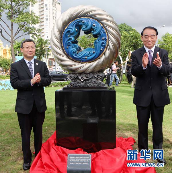 11月9日,在越南峴港APEC公園,中國外交部副部長李保東(右)、商務(wù)部副部長王受文(左)共同為中國贈(zèng)送的雕塑作品《和夢同圓》揭幕。作為2017年亞太經(jīng)合組織(APEC)領(lǐng)導(dǎo)人會(huì)議周的一部分,越南峴港APEC公園9日正式開放,展示21個(gè)成員經(jīng)濟(jì)體藝術(shù)家創(chuàng)作的雕塑。新華社記者李鵬攝