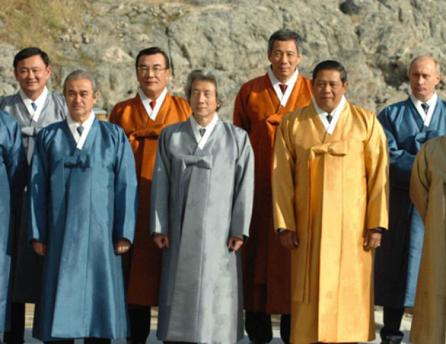1993年,首屆APEC領(lǐng)導(dǎo)人非正式會議在美國西雅圖召開。各經(jīng)濟(jì)體領(lǐng)導(dǎo)人不帶助手和隨身翻譯,不穿正裝。從那以后,在一年一度的APEC領(lǐng)導(dǎo)人非正式會議期間,東道主通常會為與會領(lǐng)導(dǎo)人提供特別制作的當(dāng)?shù)貍鹘y(tǒng)服裝,在宣介東道主傳統(tǒng)文化的同時(shí),也體現(xiàn)“亞太大家庭”的理念。
