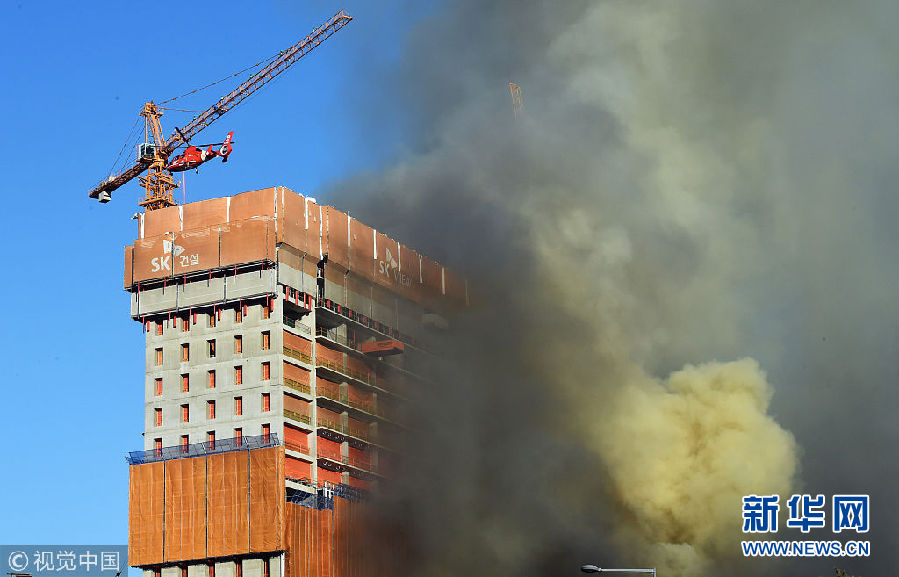 12月25日,韓國水原市,當?shù)匾惶幑⑹┕がF(xiàn)場發(fā)生火災(zāi),現(xiàn)場濃煙滾滾。(圖片來源:視覺中國)