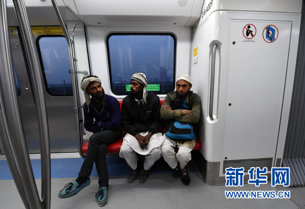 12月25日,在印度首都新德里洋紅色地鐵線,三名男子在乘車。當(dāng)日,連接新德里及其衛(wèi)星城諾伊達(dá)(Noida)之間的洋紅色地鐵線建成通車。這條線路全長12.64公里。德里地鐵公司計劃未來提高這條地鐵線路自動化水平,以“無人值守模式”運行。目前,新德里運營地鐵線路共有7條,分別用顏色命名,包括紅色、黃色、藍(lán)色、綠色、橙色、紫羅蘭和洋紅色。新華網(wǎng)發(fā) (張迺杰 攝)