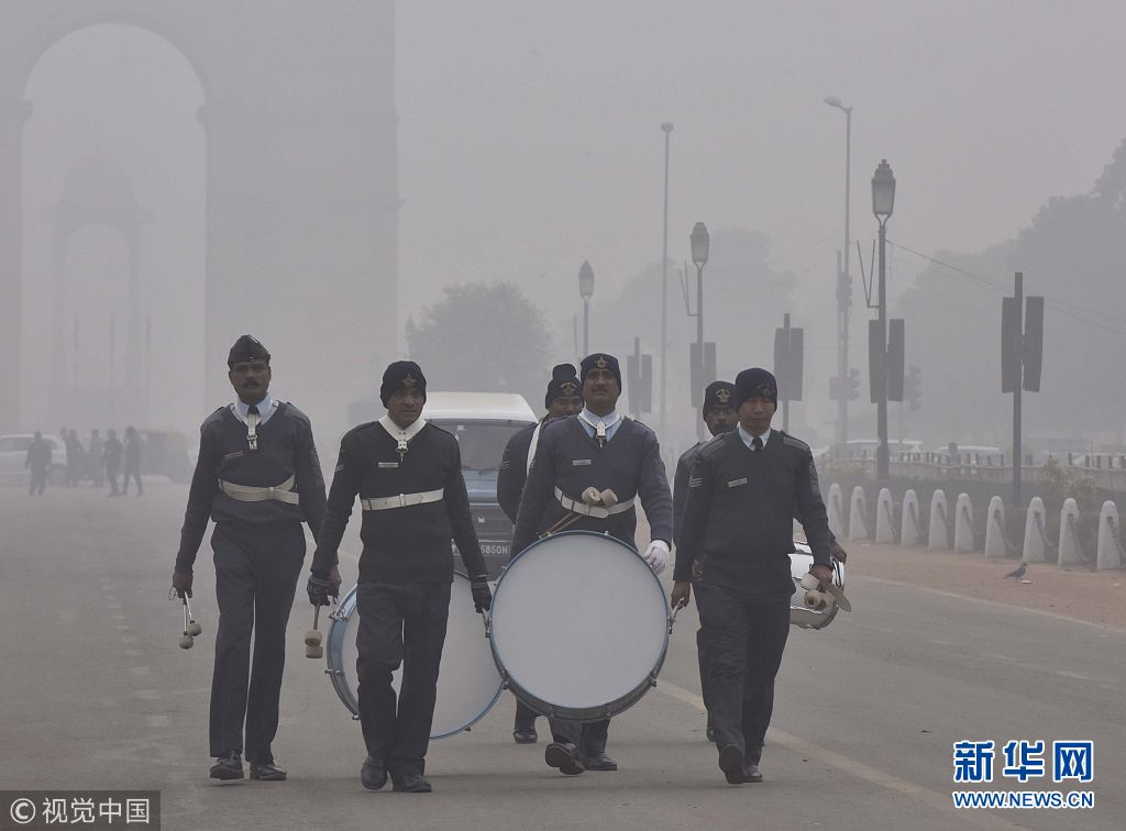 印度新德里遭遇強(qiáng)霧霾 士兵排練閱兵遭“霾藏”