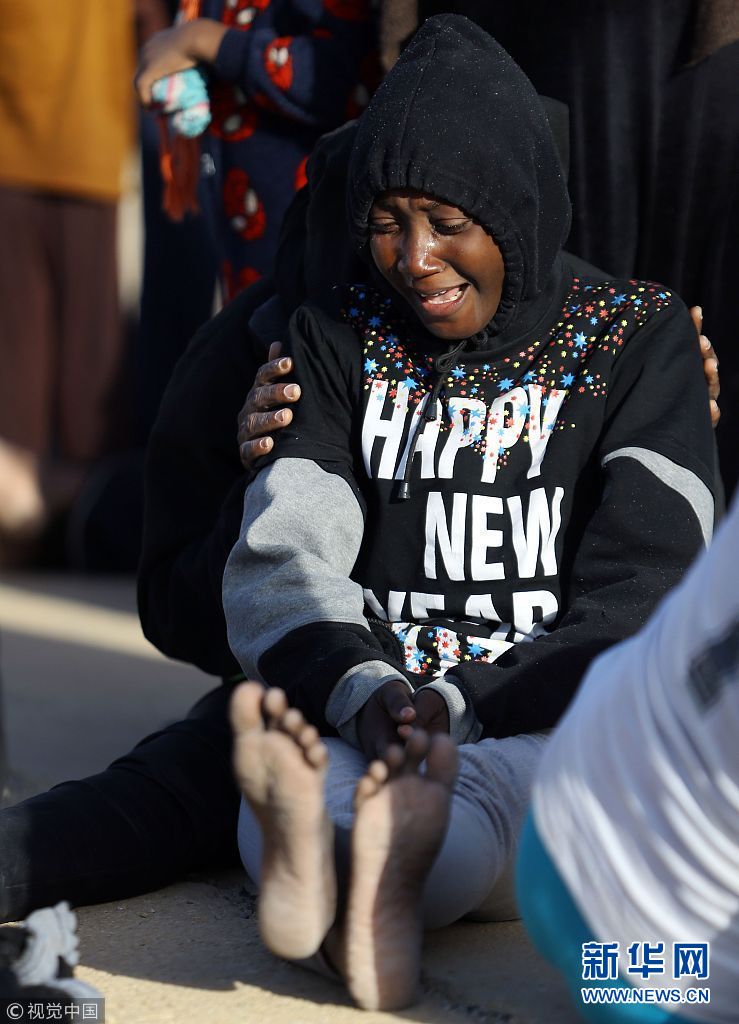 當?shù)貢r間2018年1月7日,利比亞的黎波里,獲救的非法移民。6日上午在利比亞附近海域發(fā)生了一起非法移民船傾覆事故,在巡邏飛機發(fā)現(xiàn)該遇險船只后,周圍的意大利海岸警衛(wèi)隊及意大利海軍船只迅速駛近實施救援,成功救起80余人,同時發(fā)現(xiàn)了8名遇難者。據(jù)外媒報道,這艘小船從該國海岸出發(fā)時載有超過100人。(圖片來源:視覺中國)